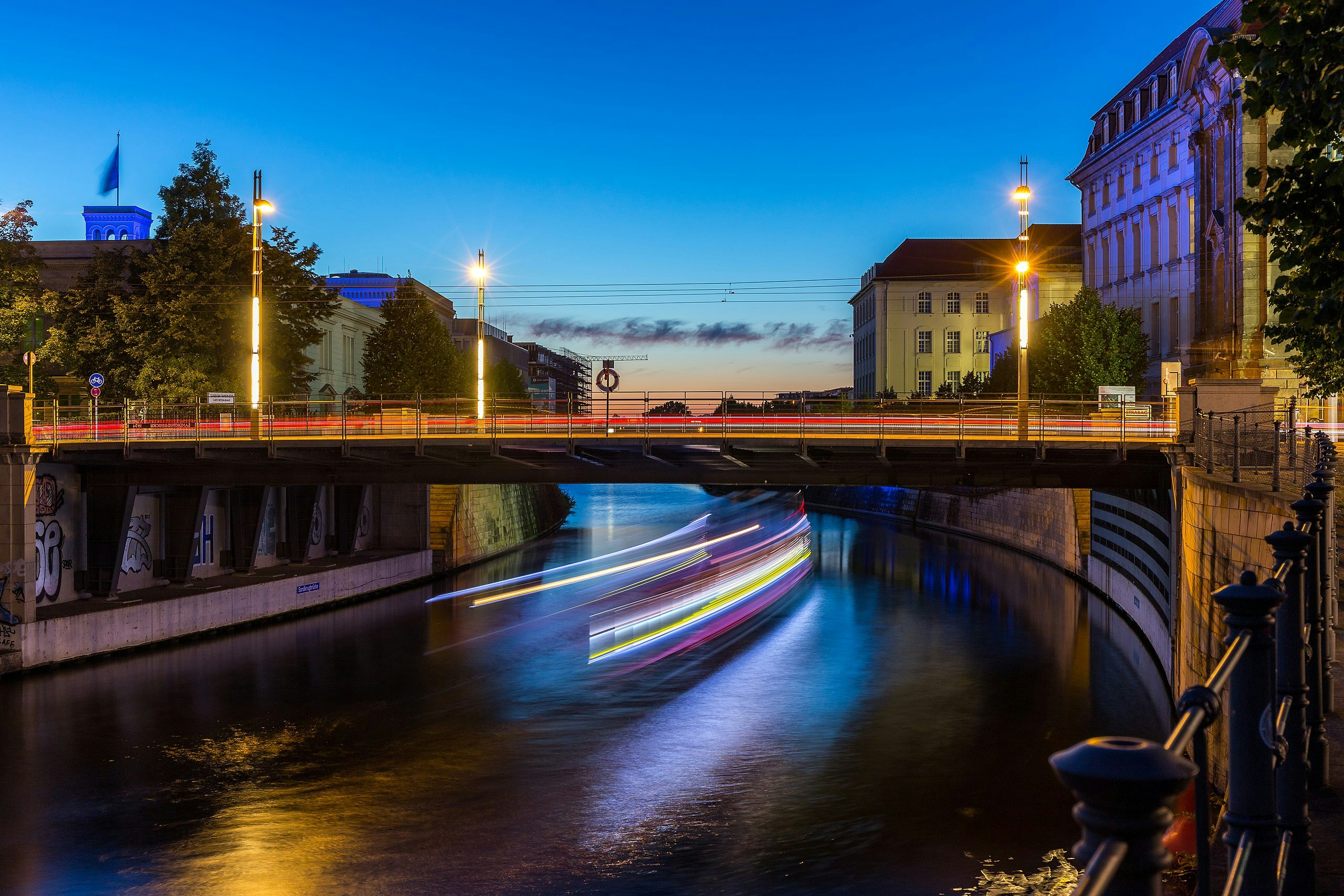 The Sandkrugbrucke is a modern bridge crossing the Berlin-Spandauer Schifffahrtskanal on Invalidenstrasse, connecting the districts of Mitte and Tiergarten. Its name comes from the "Sandkrug," an 18th-century inn that was once a popular destination for Berlin day-trippers.