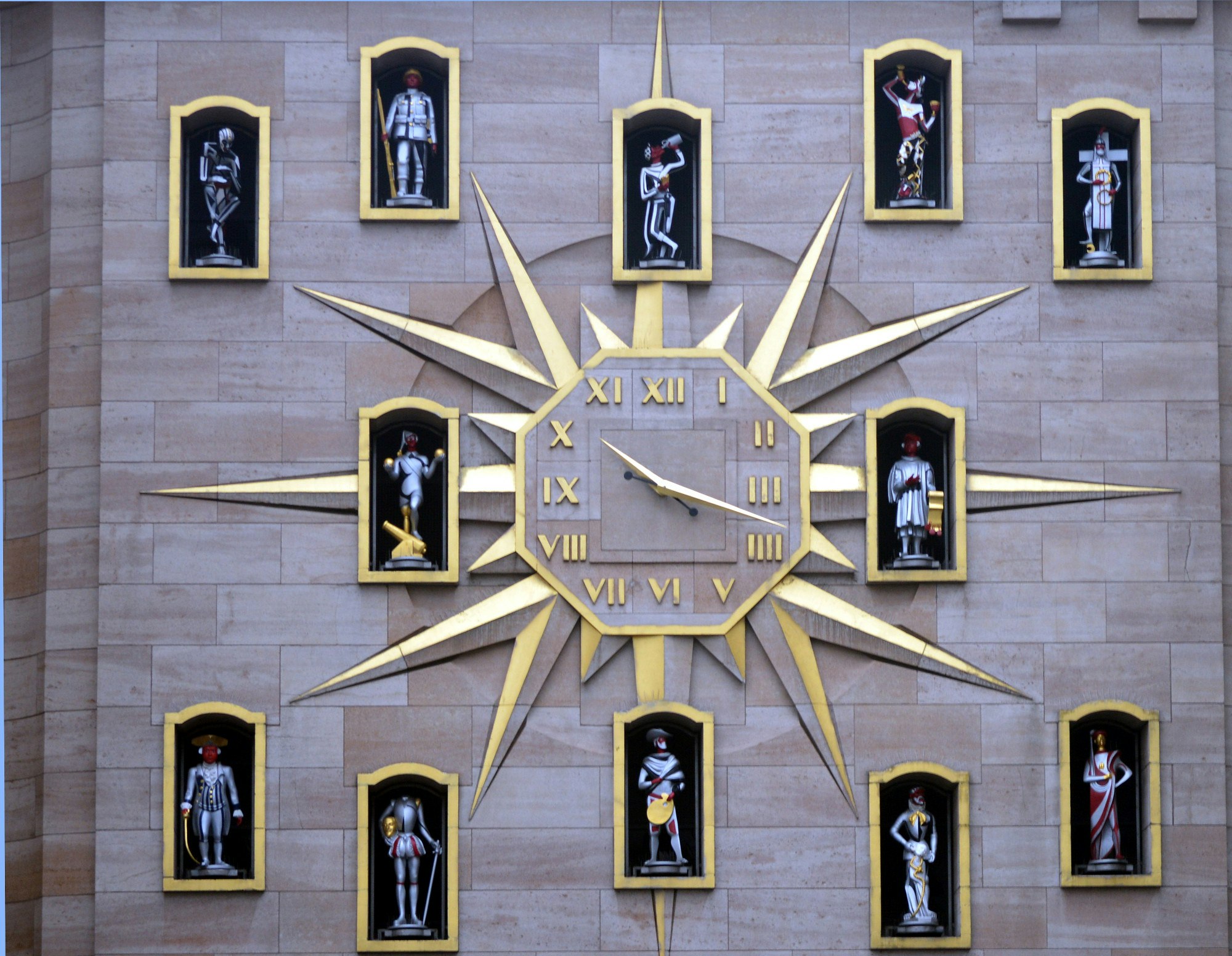 The star of the show is the Jacquemart, a 2.8-meter bronze automaton depicting a top-hatted bourgeois gentleman from Brussels. On the hour, this mechanical figure strikes the bell with theatrical precision. Rotating figurines depicting characters from Brussels history and folklore join him, creating a miniature pageant that plays out against the arcade's twelve-pointed star clock.