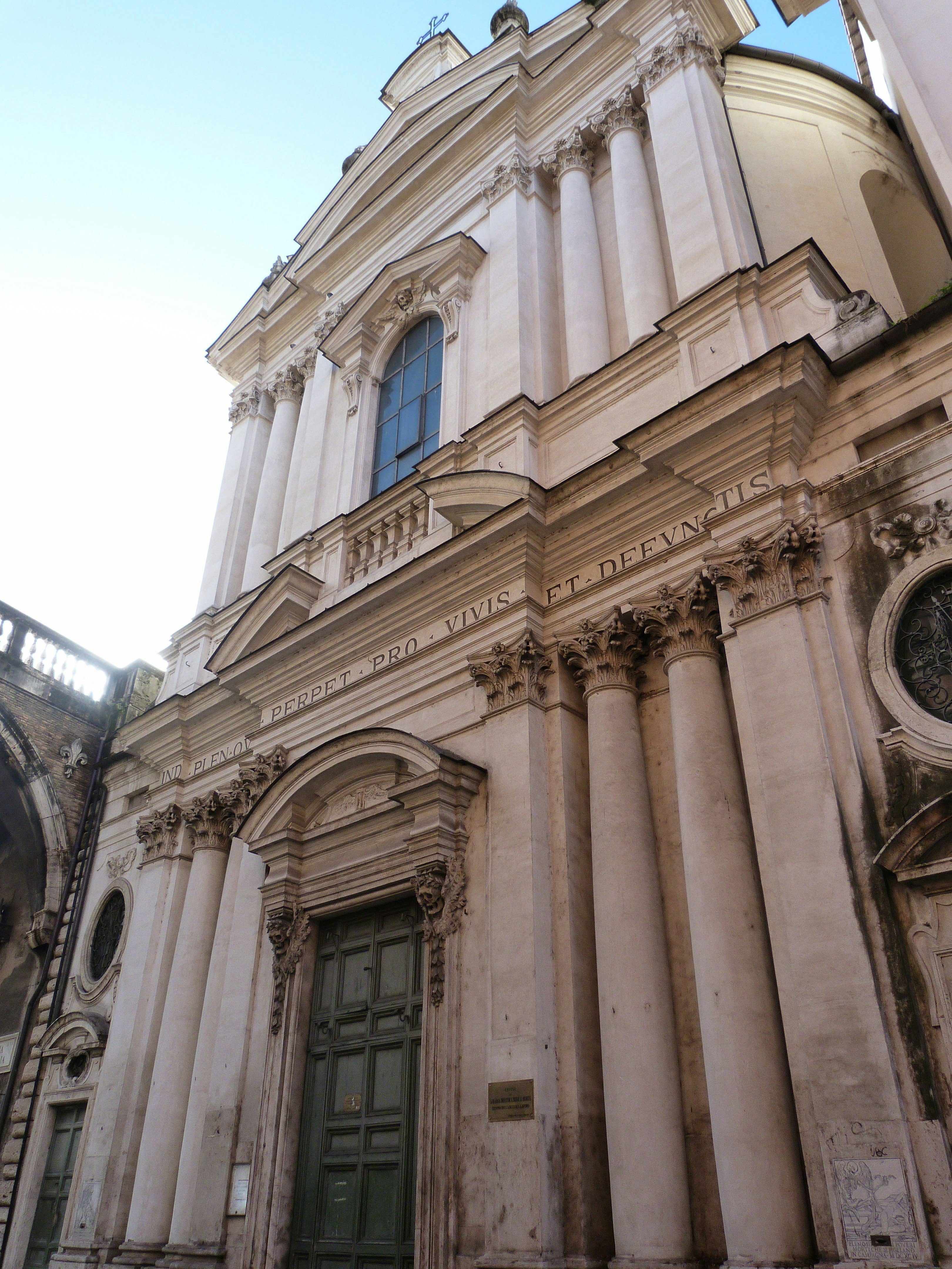 The current church was rebuilt in 1734 by architect Ferdinando Fuga using an elegant elliptical plan. The facade on Via Giulia features carved skulls and winged hourglasses, appropriate symbols for a church dedicated to death and prayer.